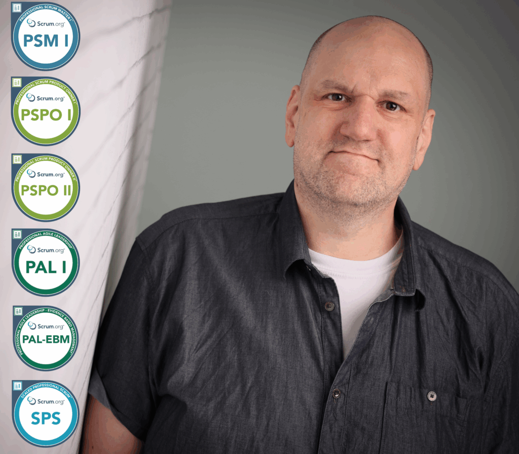Microsoft zertifizierter MCSA und MCSE sowie zertifizierter Scrum Master PSM I, Product Owner PSPO I und II, Professional Agile Lead mit PAL und PAL-EBM sowie Scaled Scrum mir Nexus SPS (Scrum.org Profil).